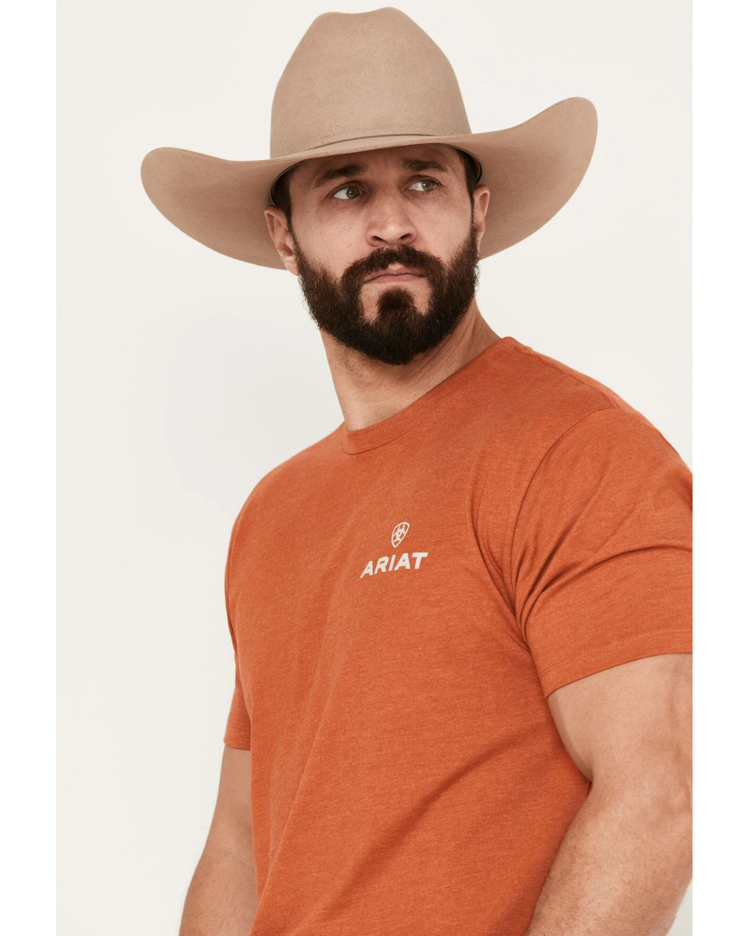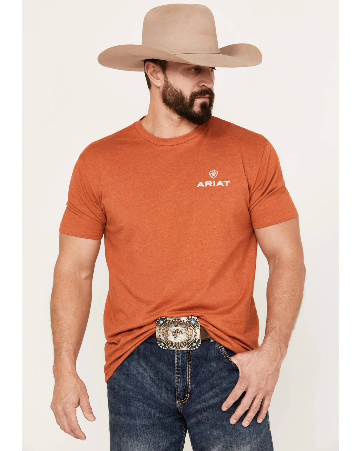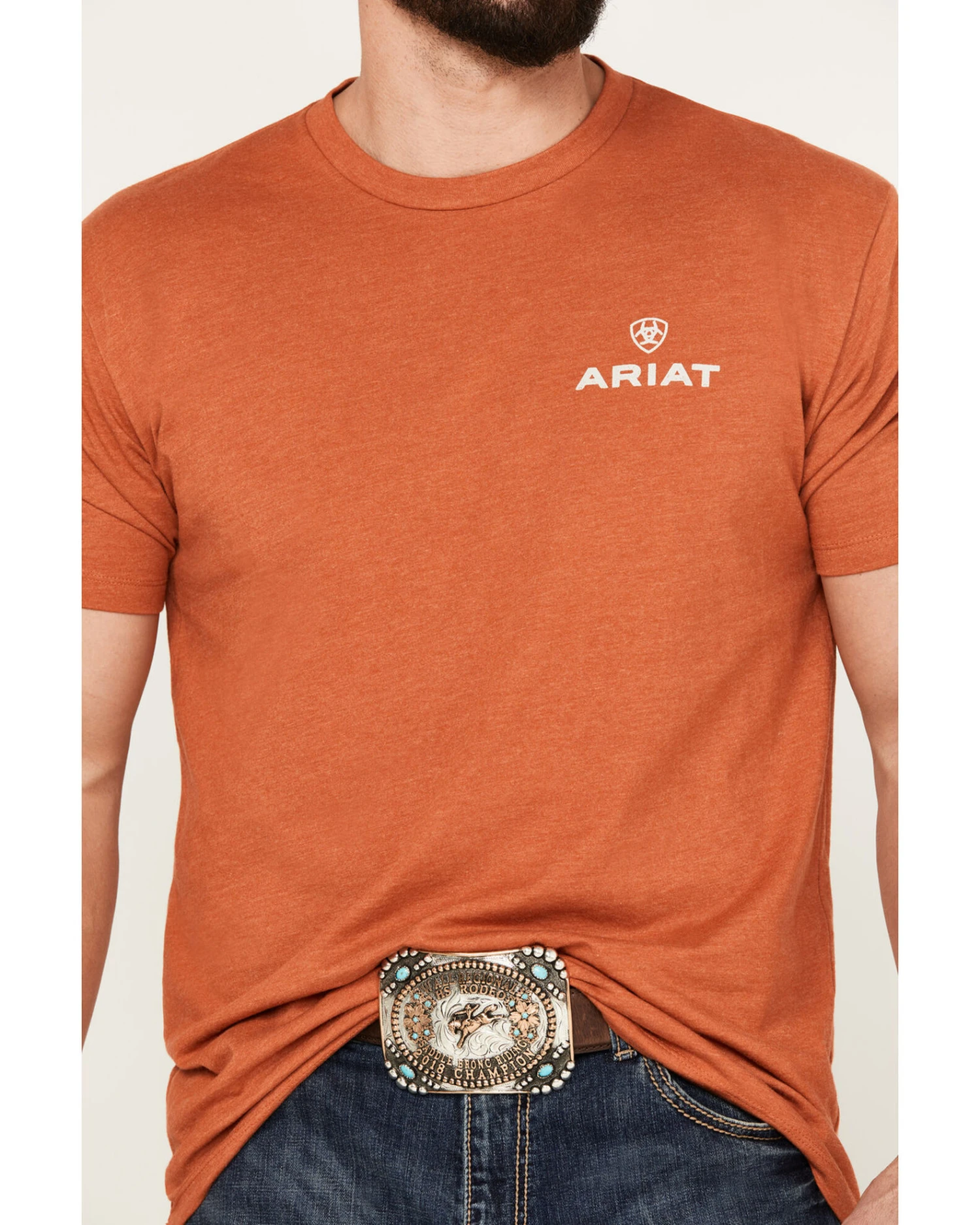 - Ariat logo graphic on left chest