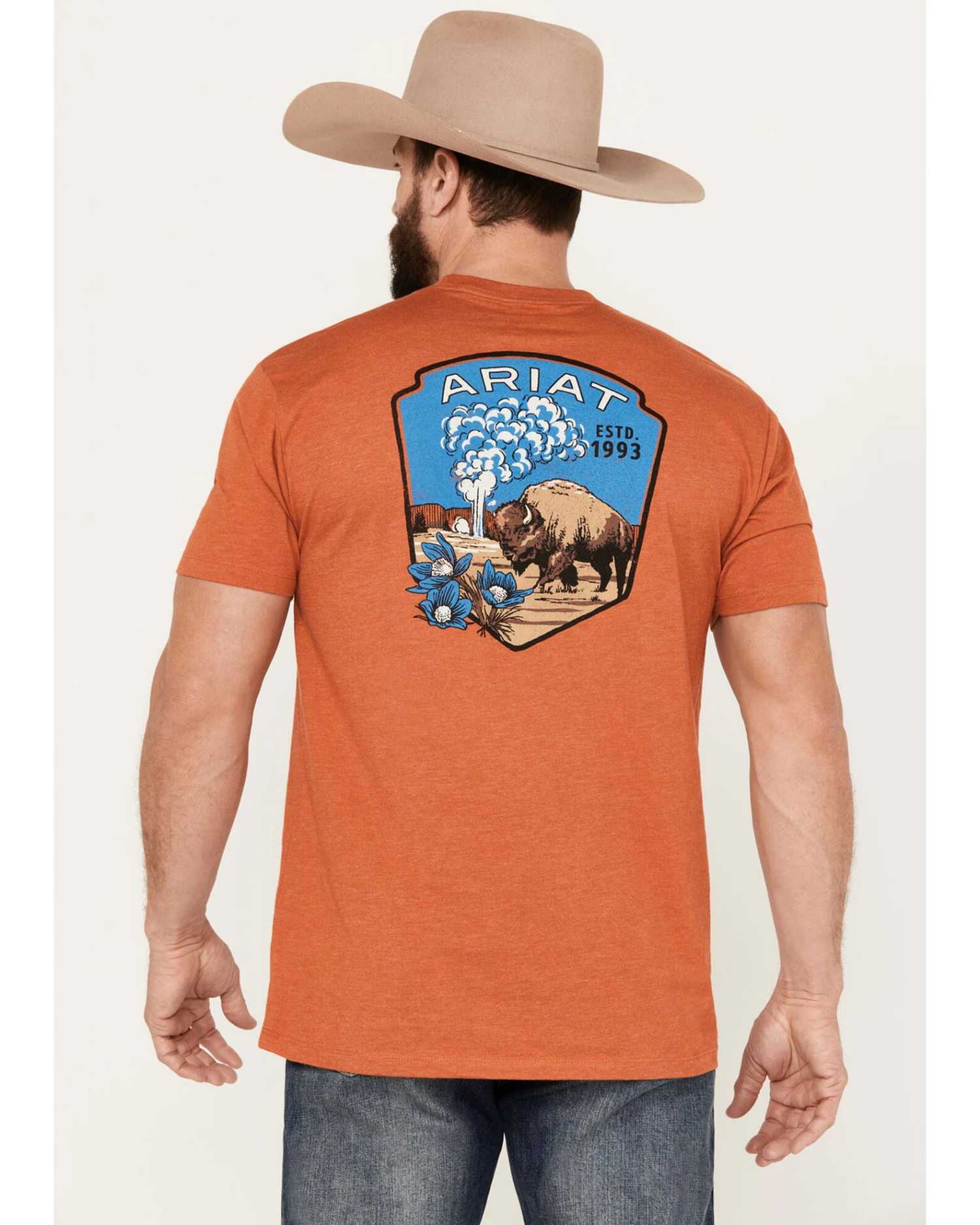 - Desert buffalo scene with Ariat logo and “EST. 1993” graphic on back