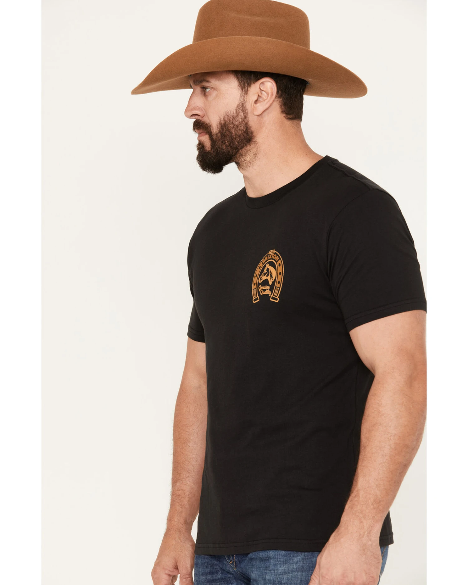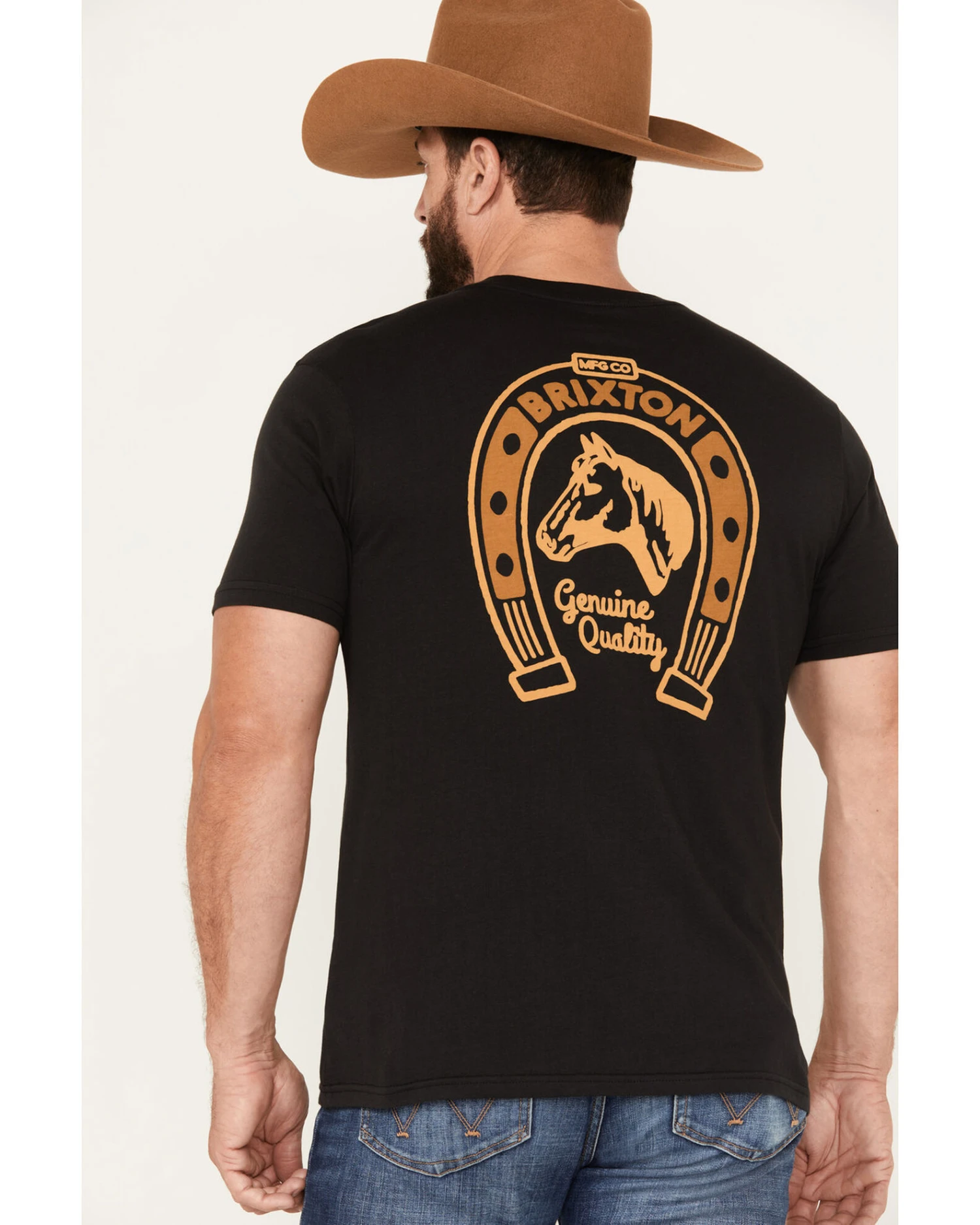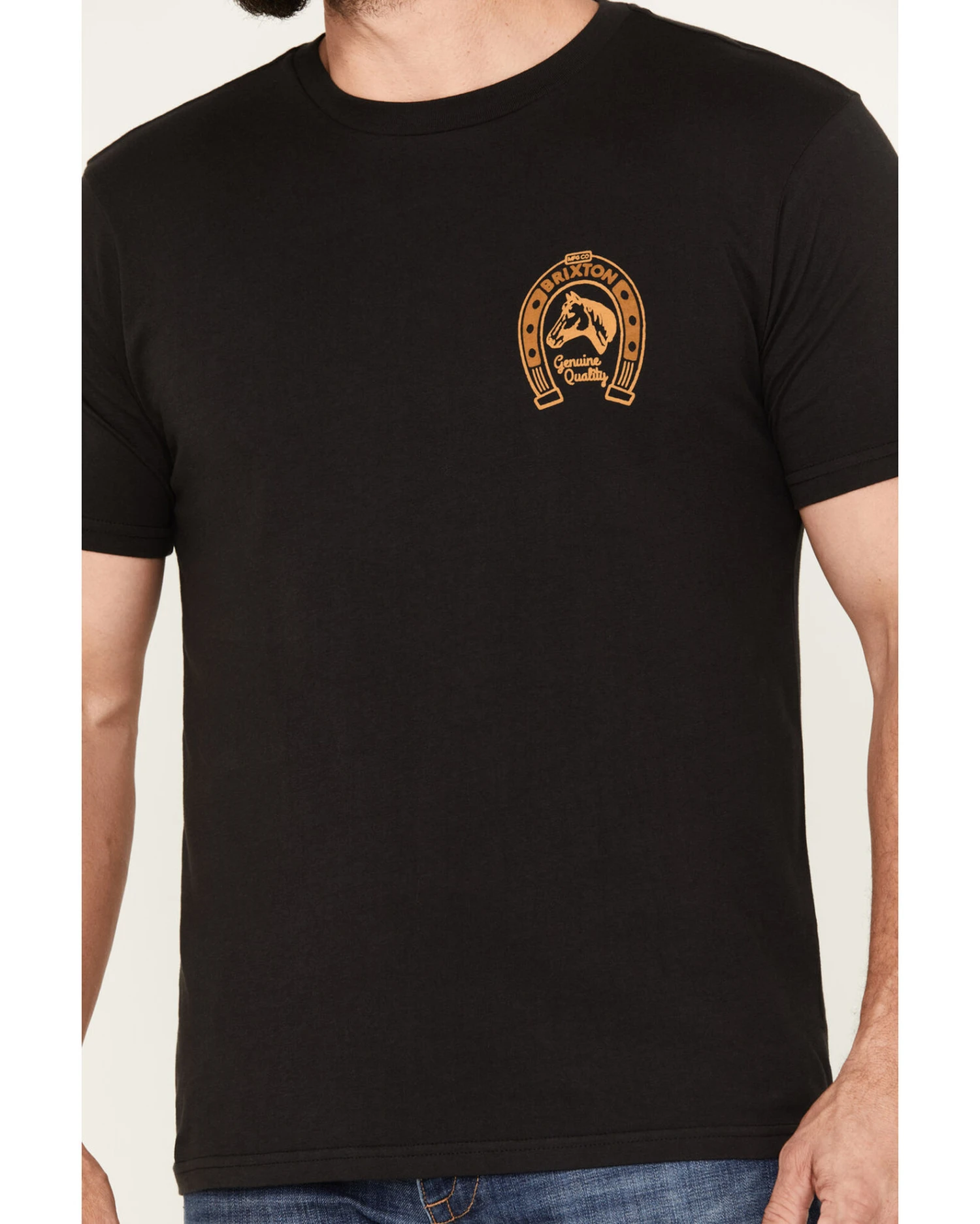 - “Brixton Genuine Quality” with horsehead and horseshoe graphic on left chest and back