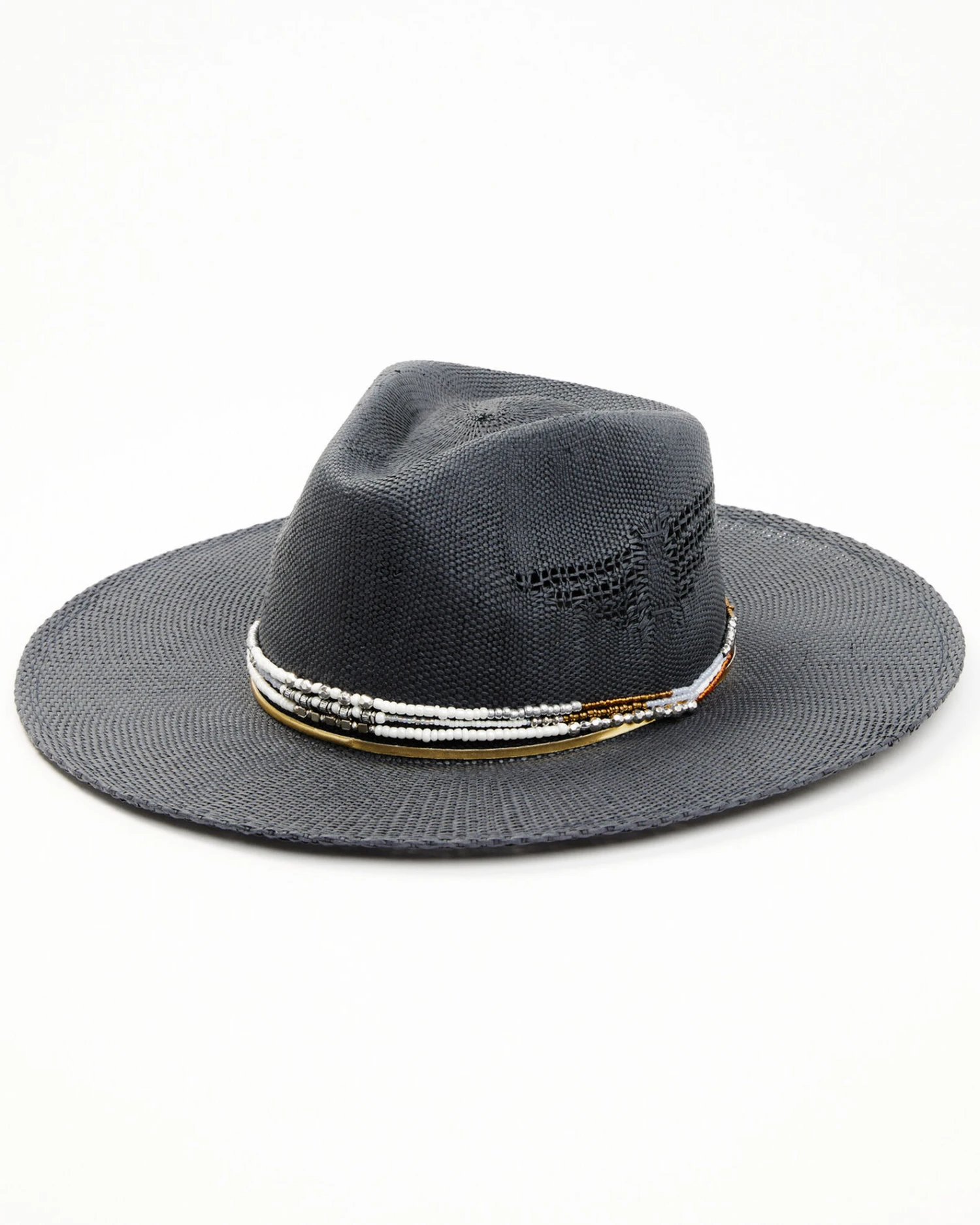 - Simple gold band and white, silver and bronze beaded hat band design
